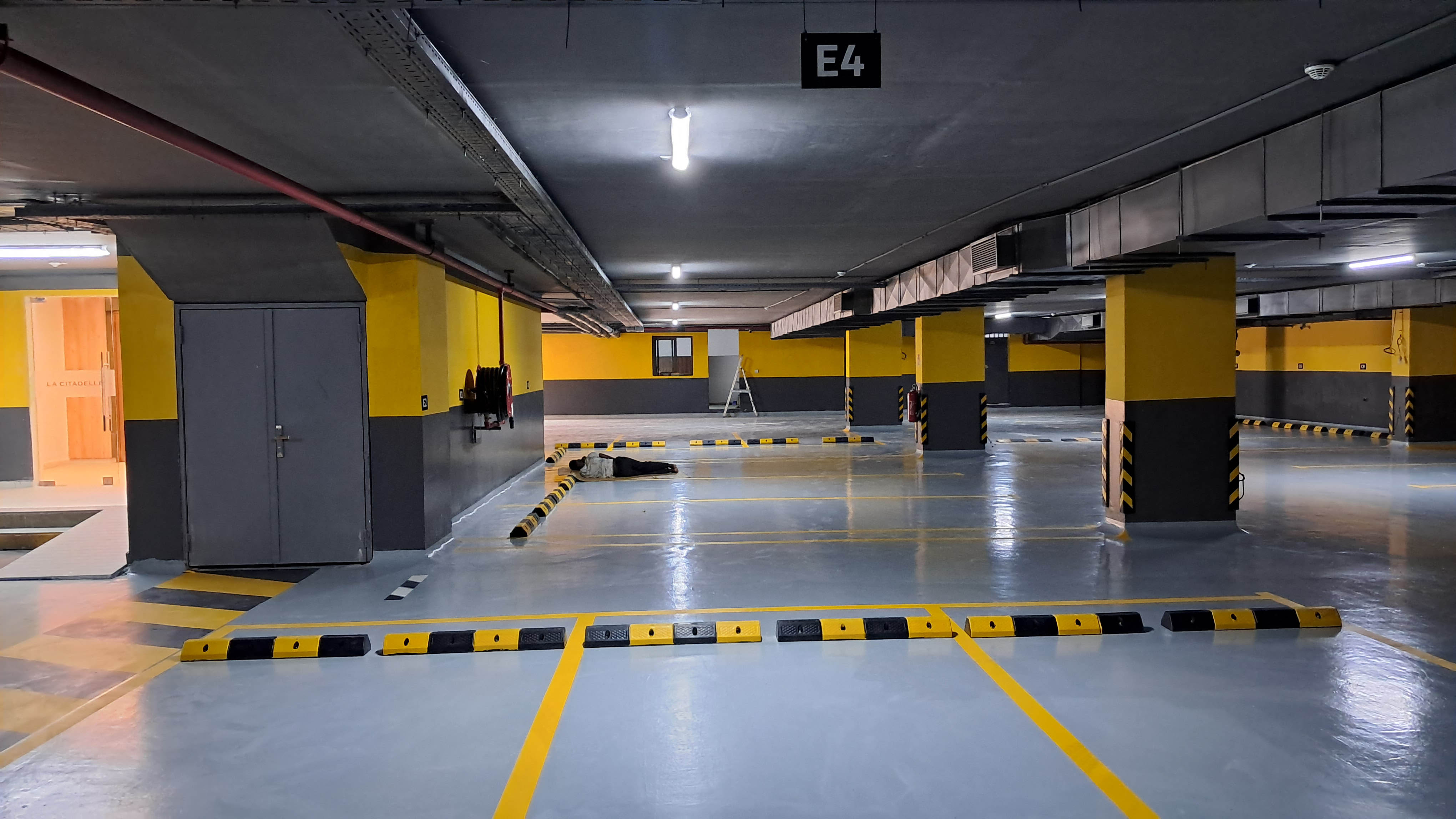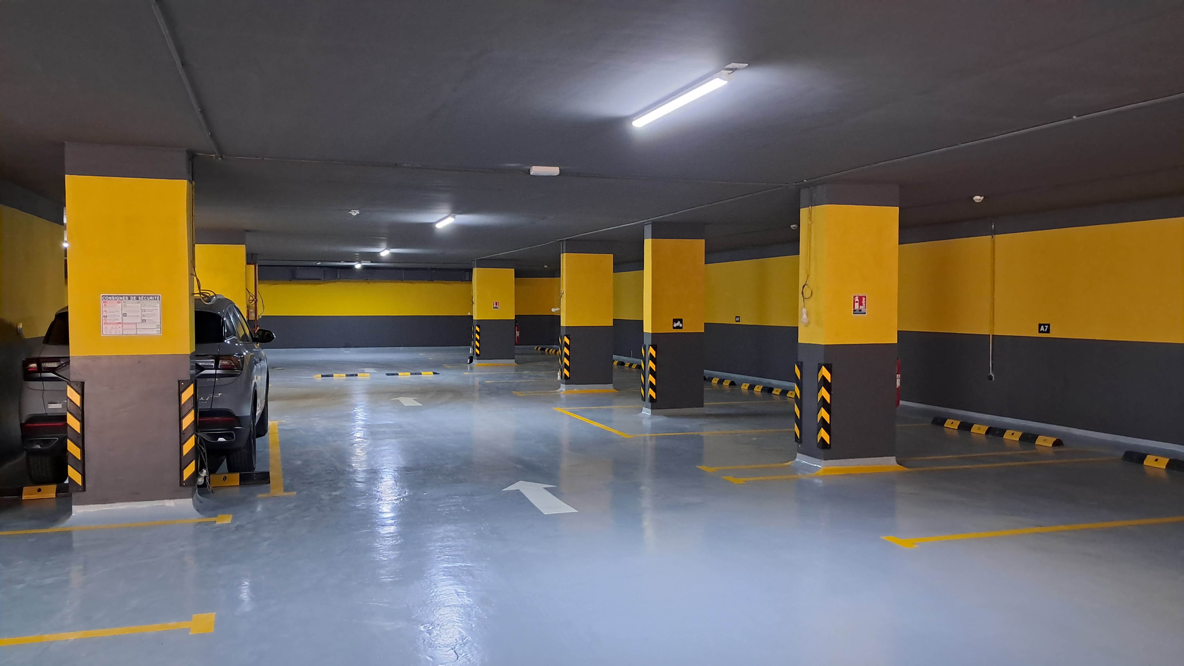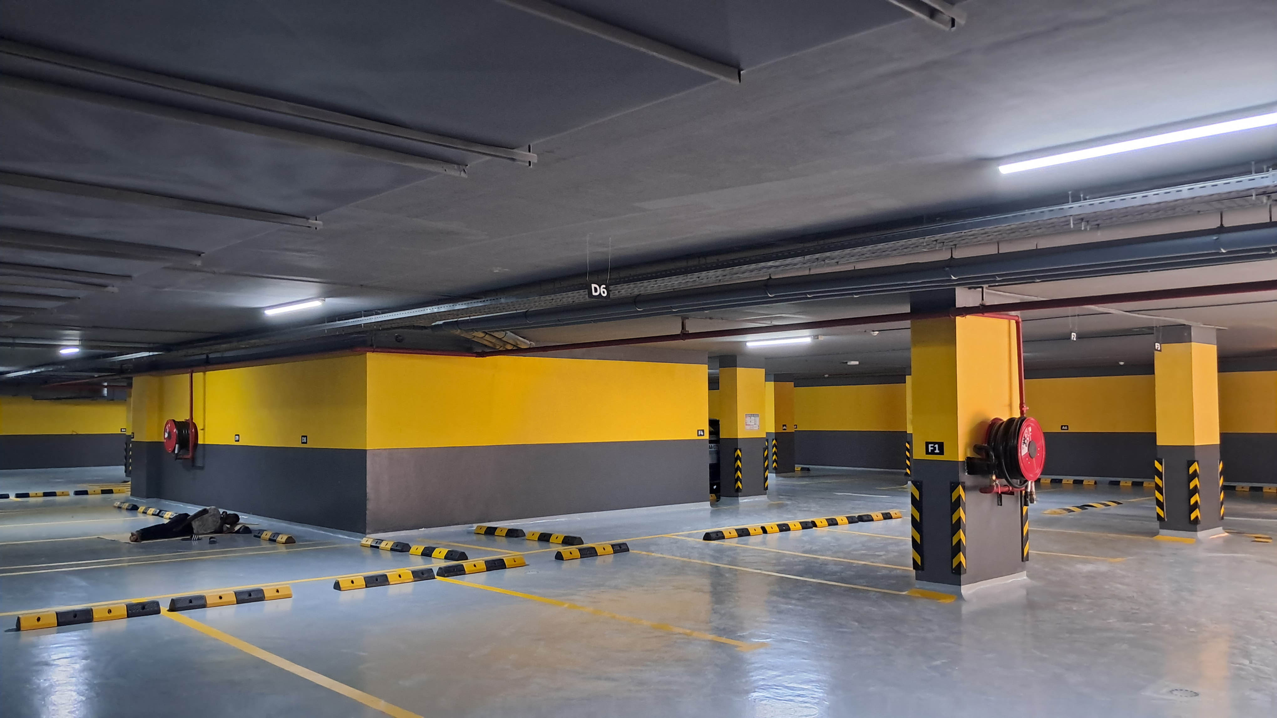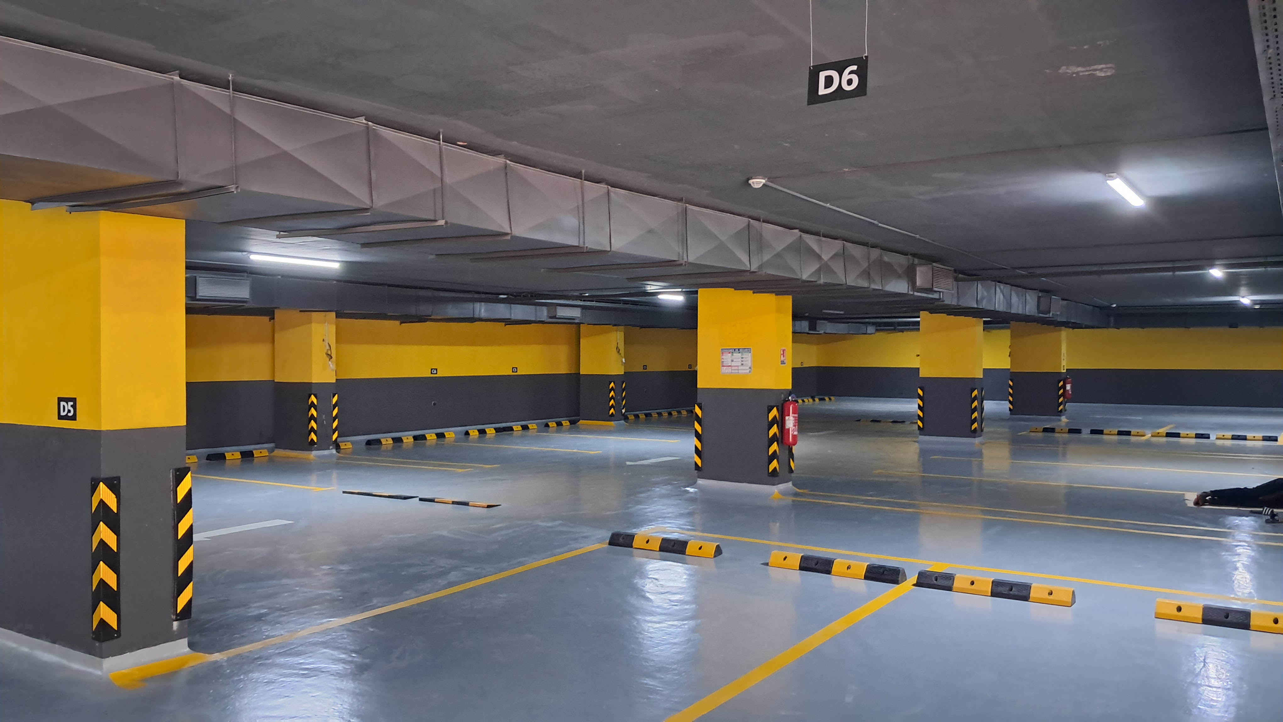 Design and Execution of Parking Area Finishes Comprehensive design and implementation of parking areas, including epoxy flooring, wall and ceiling rendering, installation of parking accessories, and precise floor marking."